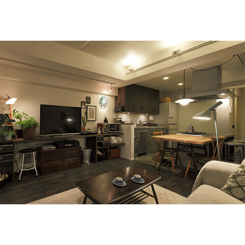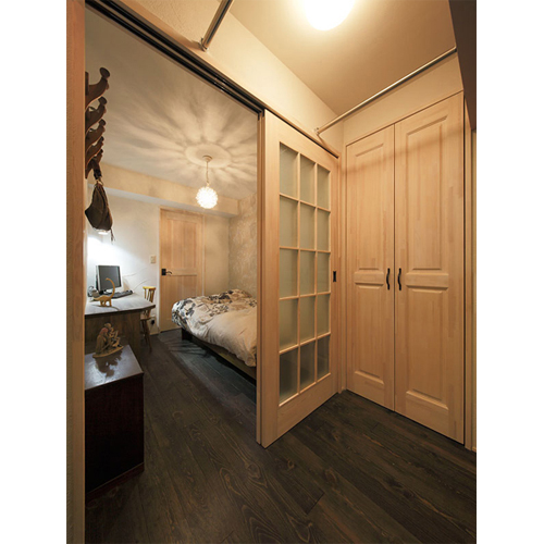 新たに購入したマンションは、玄関を入ると細長い廊下が奥に繋がっている、マンションによくある間取りでした。この間取りを上手く利用して、「LDKと水廻りの共用の空間」「収納とお二人の寝室のプライベート空間」の2つのエリアを、縦で完全に2分割しています。