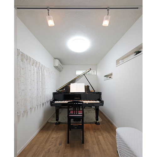 1Fは10坪に満たない限られたスペースに、LDKと主寝室、ピアノ教室、将来的なお子様のお部屋を設ける為、動線や収納に工夫をしながら間取りをプランニング致しました。