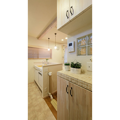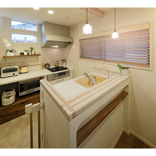 2Fは現在はLDKとして使用し、将来的にはお部屋を仕切れるように計画。キッチンは2列型を採用し、パントリーも兼ねたご家族共通の収納スペースをキッチンのコーナー部分に設けました。
