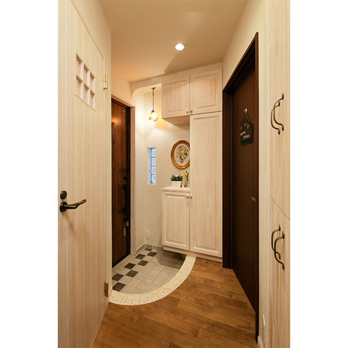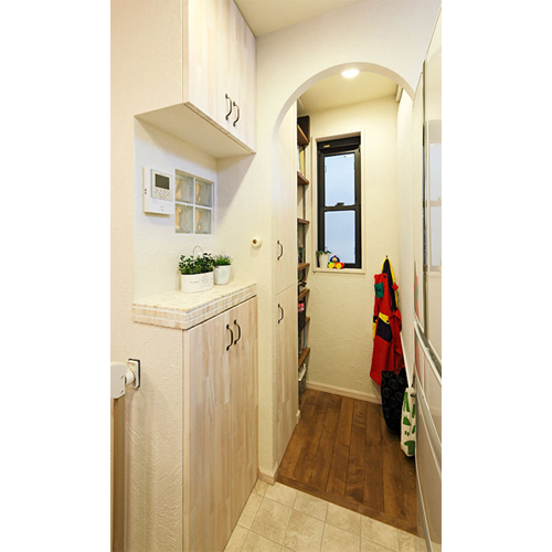 玄関のRの玄関框や正面の斜めの壁は、視覚に変化を持たせて玄関ホールに広がりを感じられるだけでなく、洗面室・トイレ等のドアが干渉せずに開けられる工夫にもなっています。