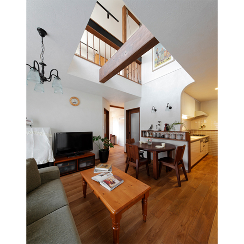 家でひときわ存在感を感じる吹き抜けの梁は、既存のものを活用。薄い木材を貼り、美しく仕上げることで、デザイン性が高くより味わい深い印象に。