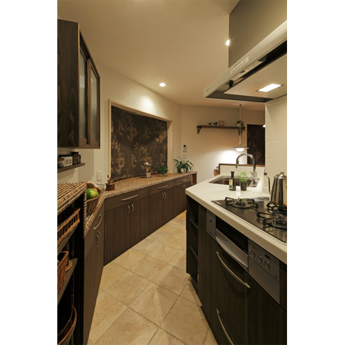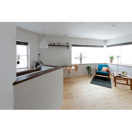 ご要望だった対面キッチン実現のため、家の斜め形状に沿ってキッチンを造作し通路幅も800mmを確保。