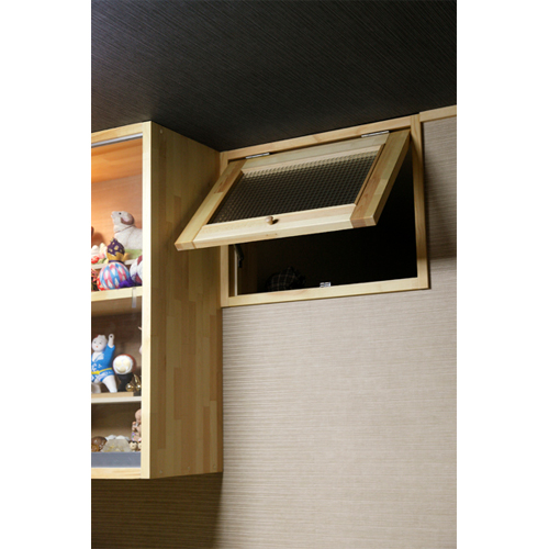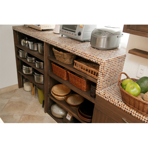 それにより、背面収納の奥行きは250mmと狭くなりますが、その分オープン収納や、壁面にたっぷりのカウンター収納を造作することで容量を増やし、奥行きが必要な家電や配膳スペースなどは、2箇所ある出窓の奥行きを利用することで解消しました。