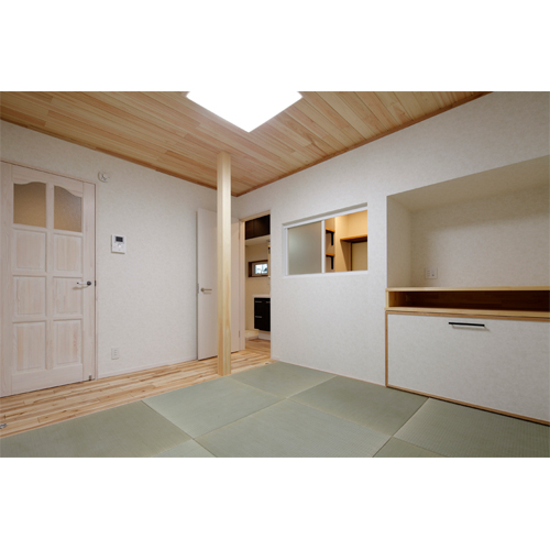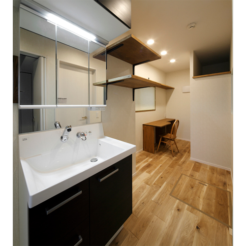 1Fには好きなバック作りをするお母様のための趣味室や通路を兼ねた脱衣室、収納やユーティリティを設け、老後の暮らしにも対応できる「暮らしやすさ」の間取りを実現しています。