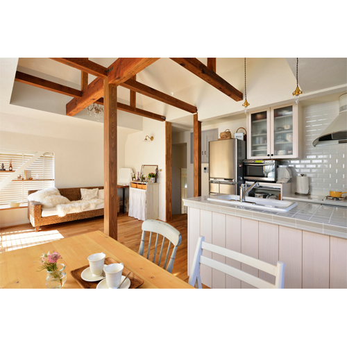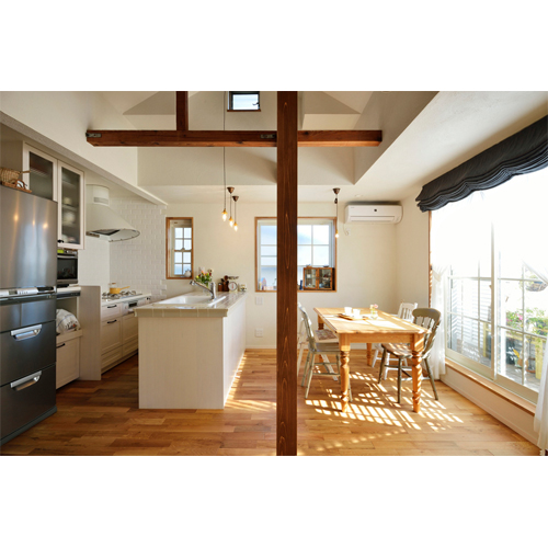 2階の物置になっていた和室と、洋室をつなげ、更に天井を抜き梁と柱を表すことで広がりと表情が生まれ、伸びやかで開放感のあふれるLDKに。