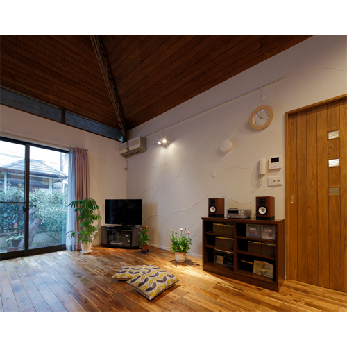 湿気でたゆんだ床下には、新聞古紙から作られる高性能断熱材「セルロースファイバー」を入れて湿気を解消。さらに床には無垢のアカシア材を、壁には珪藻土を採用し、一年中快適で心地よい空間へと、住まいの性能面もアップ。