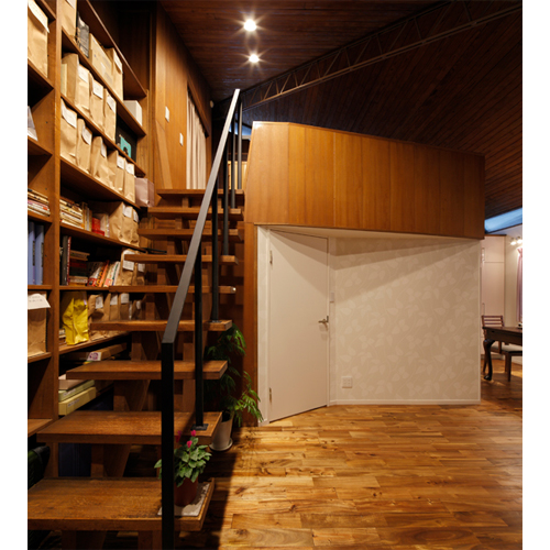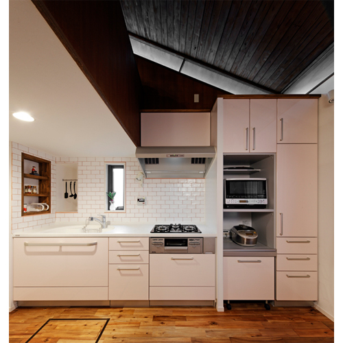 「使うものを使う場所の近くに!」というご要望を受け、生活用品のストックが便利な位置に必要な量を収納できるよう計画。ロフト下のやや暗さと閉塞感のあったキッチンは、レンジ部分を移動することで、明るさに加えLDKとしての一体感と開放的な吹抜空間に。