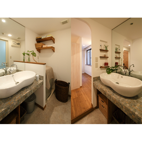 タイルには海をイメージする素材感や色合いのものを、玄関の床や洗面台、キッチンの壁やカウンターなど様々な場所に散りばめました。
