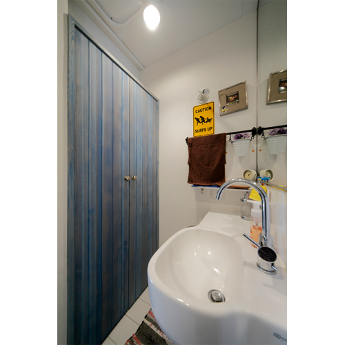 鮮やかなブルーが印象的な収納は、インテリアとしても味わい深く部屋のポイントにもなっています。