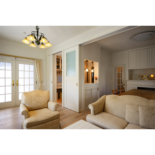 大きな間取り変更ができないことから、それぞれの世帯にお客様がいらした時、ダイニングとキッチンに廊下側から入れるようにし、扉で空間を仕切る方法をご提案。