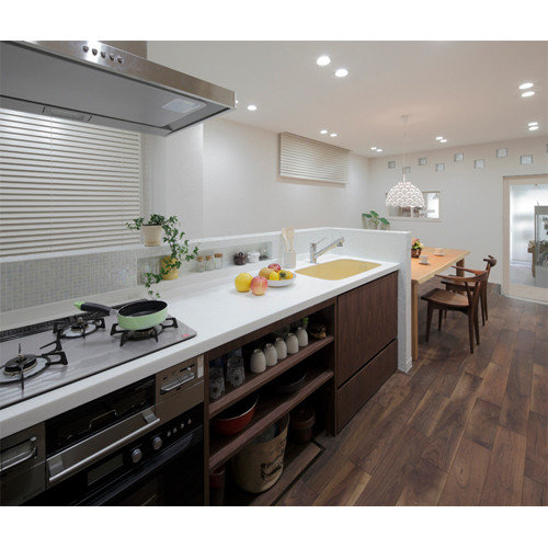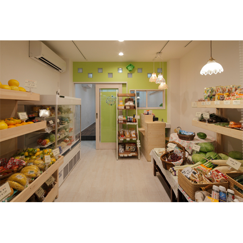 今までより規模を小さくし、青果・漬物・発酵食品等、自然食品に特化した形態に進化させた店舗と、その奥にはそれらの自然食材を活かした、Y様ご希望のマクロビオティックの料理教室を開催するキッチンスタジオを設けました。