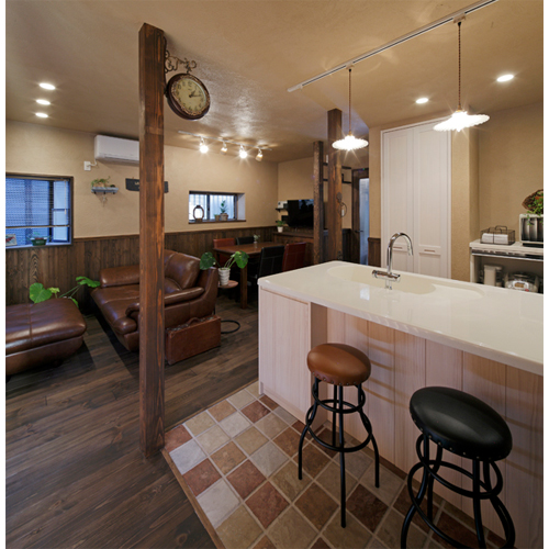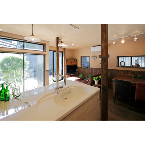 施主様ご希望通り、和室を取り込んだガーデンとも繋がる広いLDKとなり、「この空間がとても居心地がよく、ほとんどの時間をLDKで過ごしている。収納も使いやすく、小物が散らかってもすぐに片付けられて助かる。」とお喜びいただきました。