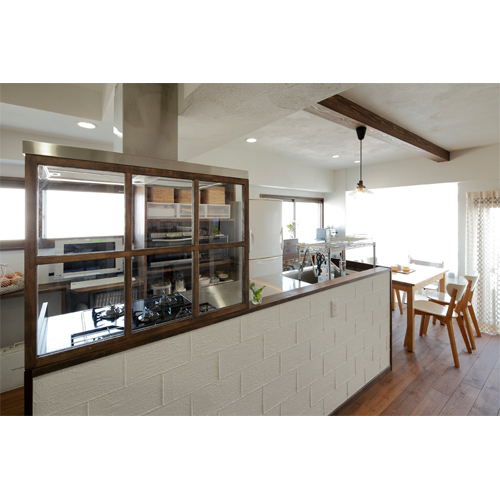 奥様ご希望のキッチンは造作し、家中を見渡せるよう中央に配置。また、玄関は日本家屋の外と内をつなげる”土間″の良さを取り入れています。