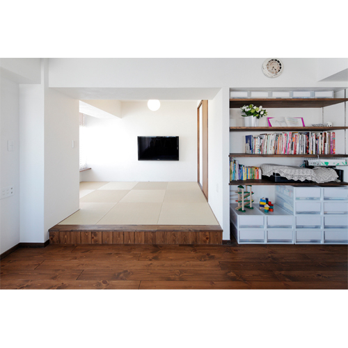 細かく区切られていた間取りは、大胆にワンフロアのように変更。お子様に常に目が届くよう、居室にはあえて扉を設けず、段差や仕上げ材の違いでスペースを仕切っています。