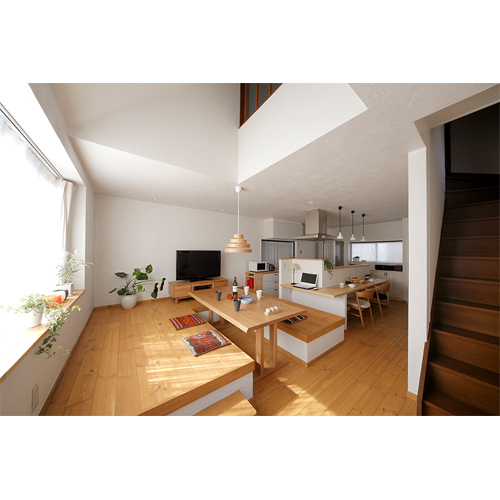 部屋の長手方向にシステムキッチンを配置して、通路を活用した対面カウンターに。アクセスしやすく椅子の場所をとらないパソコンスペースや、立ち座りのの楽な掘りごたつ風ダイニングなど、施主様の要望は全て叶えながらも、同時に「寛ぎ」に欠かせないスペースのゆとり感を大切にしました。