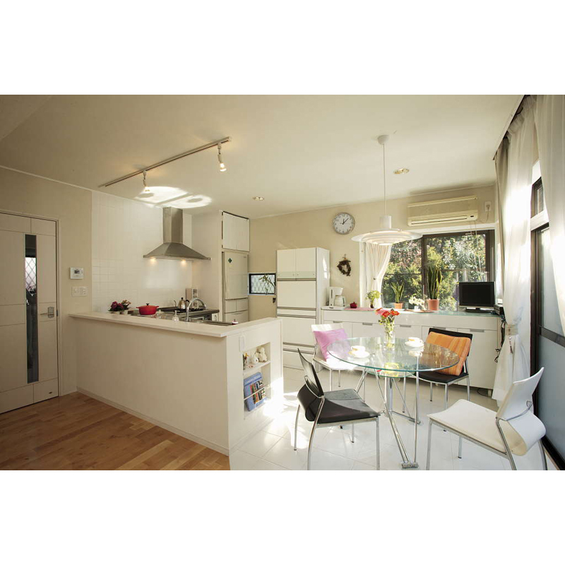 床は樺桜のフローリングと白タイルとで貼り分けました。対面式キッチンで家族の様子が伺えます。