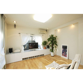 TVボードは旦那さまの手作りです。壁と天井の珪藻土は、お客様自ら手がけたお客様参加型のリフォームです。