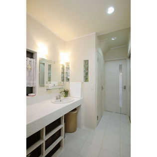 オリジナル洗面化粧台を造作。毎日何度も使うサニタリールームは、奥様のこだわり空間です。輸入の洗面ボールと水栓をセレクトしました。