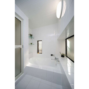 リフォーム前に使っていた青いタイルから白いタイルに貼り替え。明るく清潔感のある浴室になりました。
