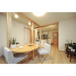 お父様お一人で住まわれていたご実家に、ご長男ご一家がもどられることになりリフォームをご依頼。お父様のスペースの和室はそのまま残されたいとのことでしたので、全体的に『和』をイメージしたデザインにして、リビングには皆さんで囲める大きなダイニングテーブルを造作しました。