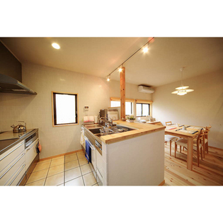 1Fは基本的にワンルームにして明るく広い間取りを実現しました。リビング中央に作った吹き抜けは、2Fのファミリーリビングと繋がっていて、ご家族のコミニュケーションもいつでもとることが出来る空間となっています。使った素材は床はパインの自然ワックス塗装。壁と天井は珪藻土。お家全体に断熱材セルロースファイバーを入れてお部屋はいつも快適です。