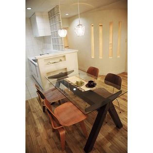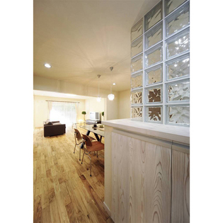 キッチンは壁側を向いていた?型キッチンを家族と対話しながら調理できる?列型キッチンに変更。シンク側の仕切りは、ガラスブロックを採用してデザイン性と明るさに配慮しました。また、リビングと隣の部屋の間仕切りは、4枚引戸にし袖壁に引き込んで収納できるようにしました。用途に合わせオーディオスペースに、あるいは寝室にフレキシブルに使い分けできます。