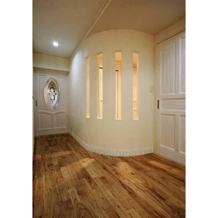 プランは寒さや結露対策として、床や壁の断熱材に自然素材で断熱性に優れたセルロースファイバーを施工。壁には珪藻土を塗り、建具は無垢のオリジナル建具、床はクリの無垢材を採用し、部屋全体での自然な調湿を可能にしました。さらに洗面スペースには4本のスリットを入れたラウンド壁を設置。水まわりの風通しをよくすると同時に、LDKに広がりを感じさせるデザイン的な効果もあります。