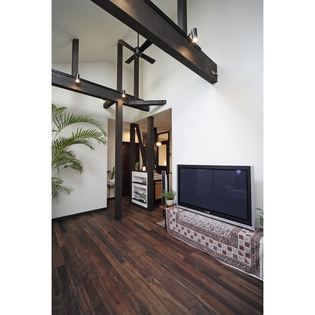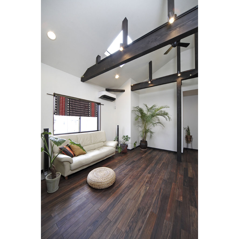バリのヴィラのような豊かな空間と、落ち着きのあるダークトーンの床で、オリジナリティあるファミリールームになりました。