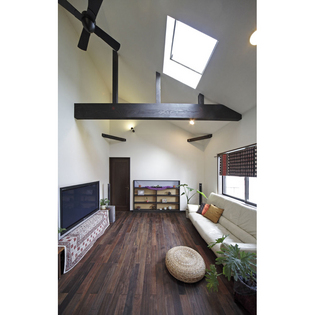 洋室から廊下を取り込み、ヨコの空間を広く生かしました。既存のトップライトを生かしながら勾配天井にすることでタテへの広がりも最大限に。梁などの構造を見せることで空間にアクセントを与え、床面積以上の大空間を体感できるようになりました。