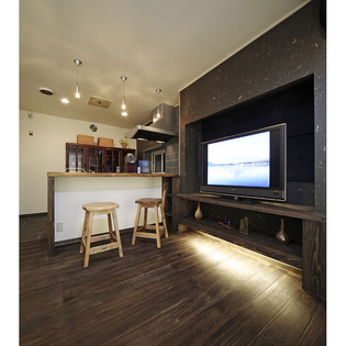 “くつろぎ”の演出として、和紙の藍・造作カウンターの杉の一枚板で統一感をだし、帰宅後にホッとできる”木”の空間になりました。