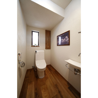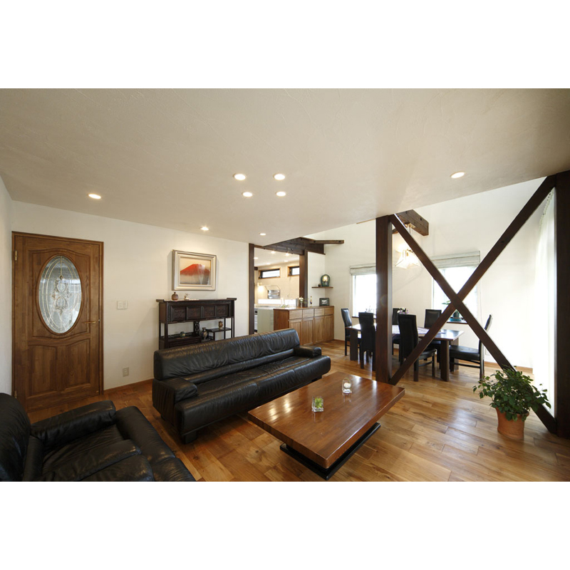 無垢フローリングは、広幅のオークを使用。黒節の力強い表情がこの空間を生かし造り上げています。