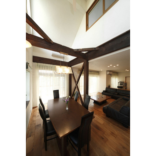 ゆとりのある空間を実現するためにダイニング空間に吹抜けを計画。既存の梁や筋交い柱などはそのまま生かすことで空間に迫力と趣を加えました。