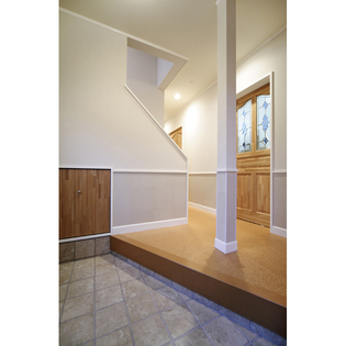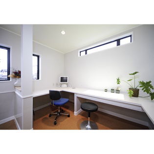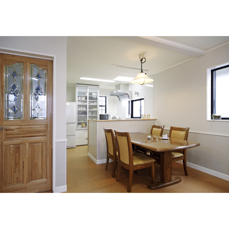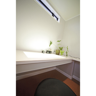 LDKは二階に移動し、光と風が通り地元の花火も部屋から楽しめる気持ちのいい空間になりました。床は以前の滑って傷つく合板フロアをやめてコルクを貼り、腰壁にもコルクを貼ることでワンちゃんが滑らす傷や汚れの付きにくく、ヒトもワンちゃんも快適に暮らせるお部屋に。お子さまのワークスペースは、2階リビングの一部を増築し、コの字型デスクを造り付けました。天板の一部にガラスをはめ込み、下に蛍光灯を入れることでトレース作業もできるようになり、部屋にこもりがちだったお子さまも、リフォーム後は家族と一緒にすごす時間が増えたそうです。