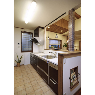 I様のご要望は、広いLDKとしっかりした断熱。4匹の猫が自由に出入りできるようになど。そこで、光が差し込む南東側にLDKを配置し、中心には、ポイントになる梁を見せ、天井高4Mの開放的な空間に。ガラスブロックで暗い廊下にほのかな光と,曲線で柔らかな印象を与えることに。犬のお昼寝スペースはタイル敷きに。自由に出入できる猫ドアを設置。今まで閉鎖的だった個々の部屋を開放的な一空間にすることで動線・光・風通しを確保でき、人とペットが自然と集まれる空間になりました。