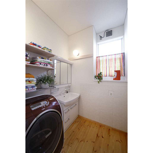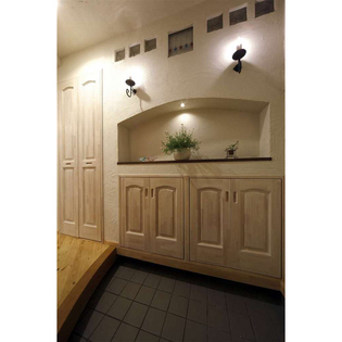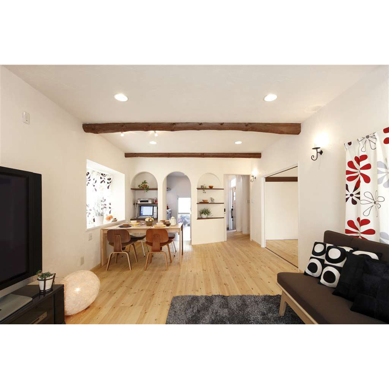 ご家族が普段からリビングに集まっていることから、リビングダイニングをメインに造作。デザインは「手作り感のあるナチュラルカントリー」とご要望でしたので、素朴、有機的を連想し、直線は作らず、ワクワクするような空間を考え、テーマを「白い洞窟」としました。鍾乳洞にある岩棚のような湾曲した棚や土壁開口を少し狭くし、筋交いの間に開口を作り洞窟をイメージさせる空間になりました。
