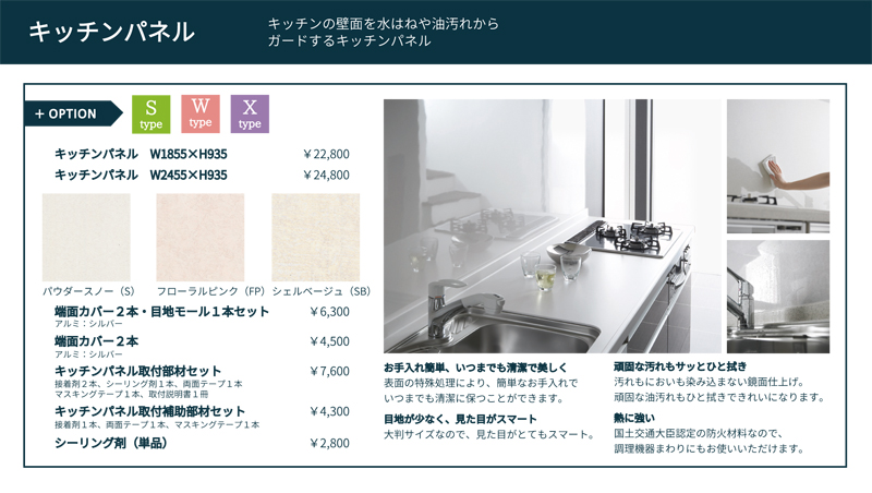 ※セット内容にキッチンパネル、ベースキャビネットのエンドパネル(両端)、レンジフード横幕板、吊戸棚用エンドパネルは含まれておりません。