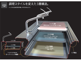 • シンクの底面に近づくほど奥行きを広くとったフラスコ形状。大鍋などが簡単に洗え、さらに水はねを防ぎます。シンクを上面・中面・底面に分け、それぞれを立体活用することで、いままでできなかった流れ作業(平行調理)が可能に。急な来客でもプレートを上段で並べれば、使い終わったお皿などを簡単に目隠しできる、ワイドでゆったりな3Dシンクです。