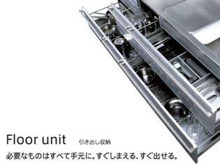 • 奥行きの深さが生み出す、大容量の収納空間。置き場所がないとあきらめていた大型のパスタ鍋や中華鍋がラクラク背理、調理の幅も広がります。引出しタイプなので腰をかがめることなく出し入れが可能で、動線のムダをなくします。