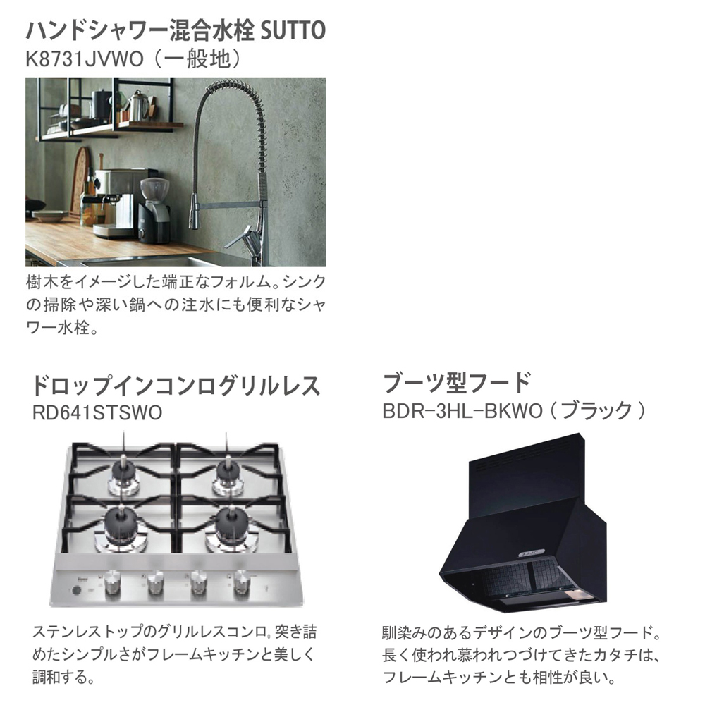 WOODONE(ウッドワン) KUROMUKU フレームキッチン 壁付けI型 W2100 奥行650 ステンレス×オークの説明