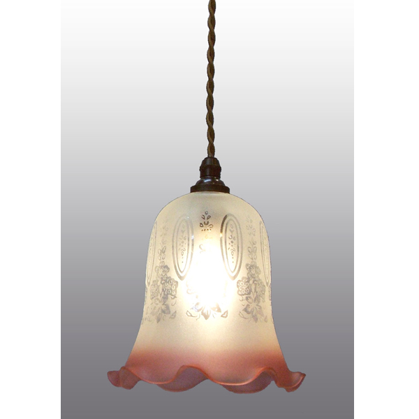 ガラスシェードは、吹きガラス工法または型押しガラス工法で作成されています。ガラスシェード内に気泡が残ることがあったり、形の若干のゆがみや、中心線のずれなどが起きることがあります。また、エッチング技法を使ったガラスシェードは手作業のため、模様にわずかな曲がり等が起きることがあります。