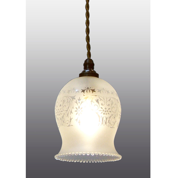 ガラスシェードは、吹きガラス工法または型押しガラス工法で作成されています。ガラスシェード内に気泡が残ることがあったり、形の若干のゆがみや、中心線のずれなどが起きることがあります。また、エッチング技法を使ったガラスシェードは手作業のため、模様にわずかな曲がり等が起きることがあります。