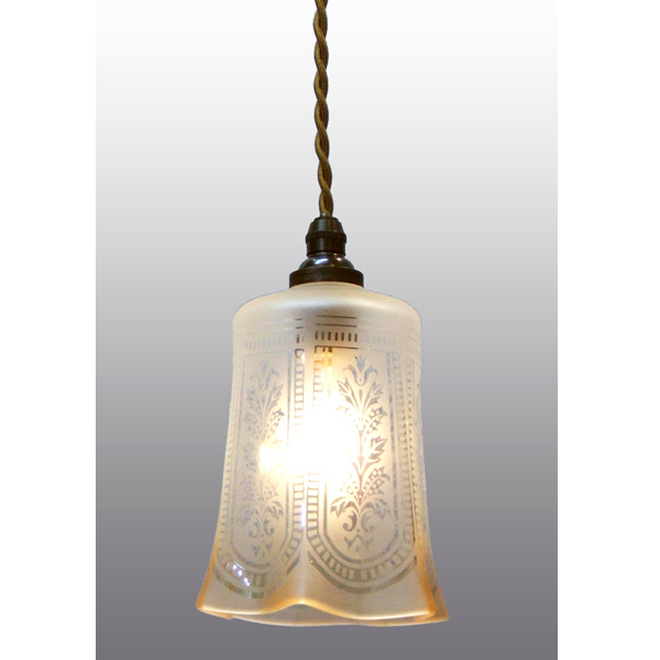 ガラスシェードは、吹きガラス工法または型押しガラス工法で作成されています。ガラスシェード内に気泡が残ることがあったり、形の若干のゆがみや、中心線のずれなどが起きることがあります。また、エッチング技法を使ったガラスシェードは手作業のため、模様にわずかな曲がり等が起きることがあります。