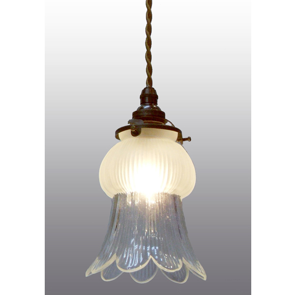 ガラスシェードは、吹きガラス工法または型押しガラス工法で作成されています。ガラスシェード内に気泡が残ることがあったり、形の若干のゆがみや、中心線のずれなどが起きることがあります。また、エッチング技法を使ったガラスシェードは手作業のため、模様にわずかな曲がり等が起きることがあります。