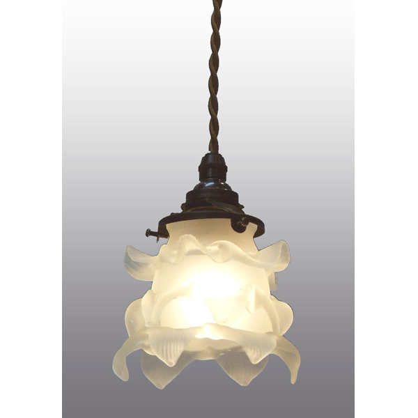 ガラスシェードは、吹きガラス工法または型押しガラス工法で作成されています。ガラスシェード内に気泡が残ることがあったり、形の若干のゆがみや、中心線のずれなどが起きることがあります。また、エッチング技法を使ったガラスシェードは手作業のため、模様にわずかな曲がり等が起きることがあります。