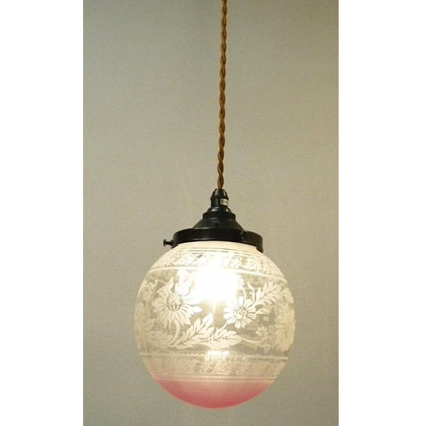 ガラスシェードは、吹きガラス工法または型押しガラス工法で作成されています。ガラスシェード内に気泡が残ることがあったり、形の若干のゆがみや、中心線のずれなどが起きることがあります。また、エッチング技法を使ったガラスシェードは手作業のため、模様にわずかな曲がり等が起きることがあります。