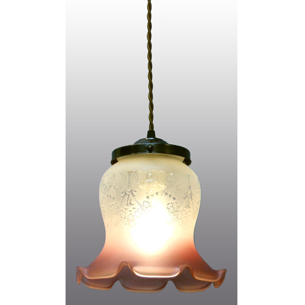 ガラスシェードは、吹きガラス工法または型押しガラス工法で作成されています。ガラスシェード内に気泡が残ることがあったり、形の若干のゆがみや、中心線のずれなどが起きることがあります。また、エッチング技法を使ったガラスシェードは手作業のため、模様にわずかな曲がり等が起きることがあります。