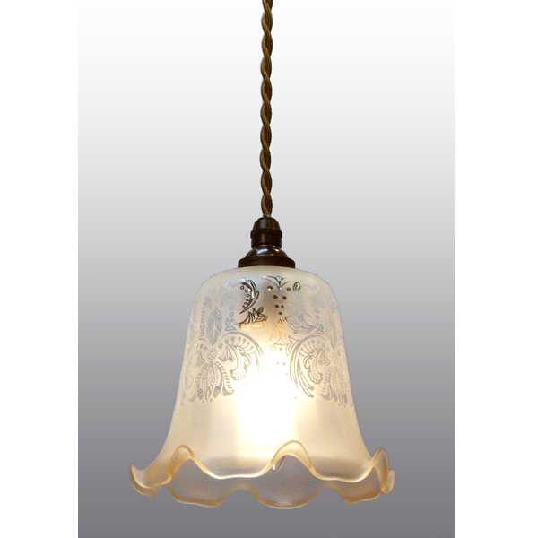 ガラスシェードは、吹きガラス工法または型押しガラス工法で作成されています。ガラスシェード内に気泡が残ることがあったり、形の若干のゆがみや、中心線のずれなどが起きることがあります。また、エッチング技法を使ったガラスシェードは手作業のため、模様にわずかな曲がり等が起きることがあります。
