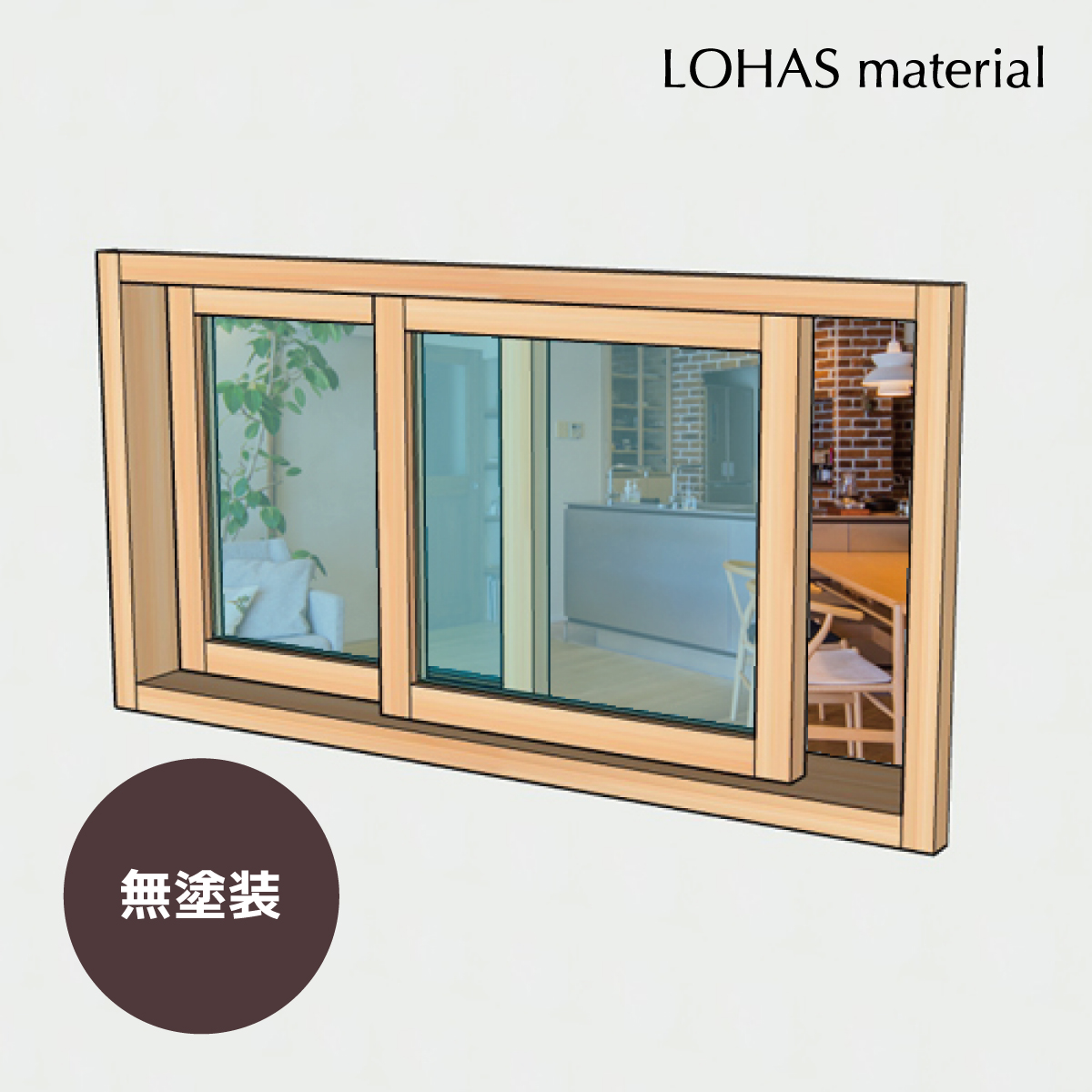 LOHAS material(ロハスマテリアル) 室内窓 通風窓 インテリアウィンドウ 引違窓(細框30mm敷居すべり仕様) パイン 無塗装 W770×H400mmの説明