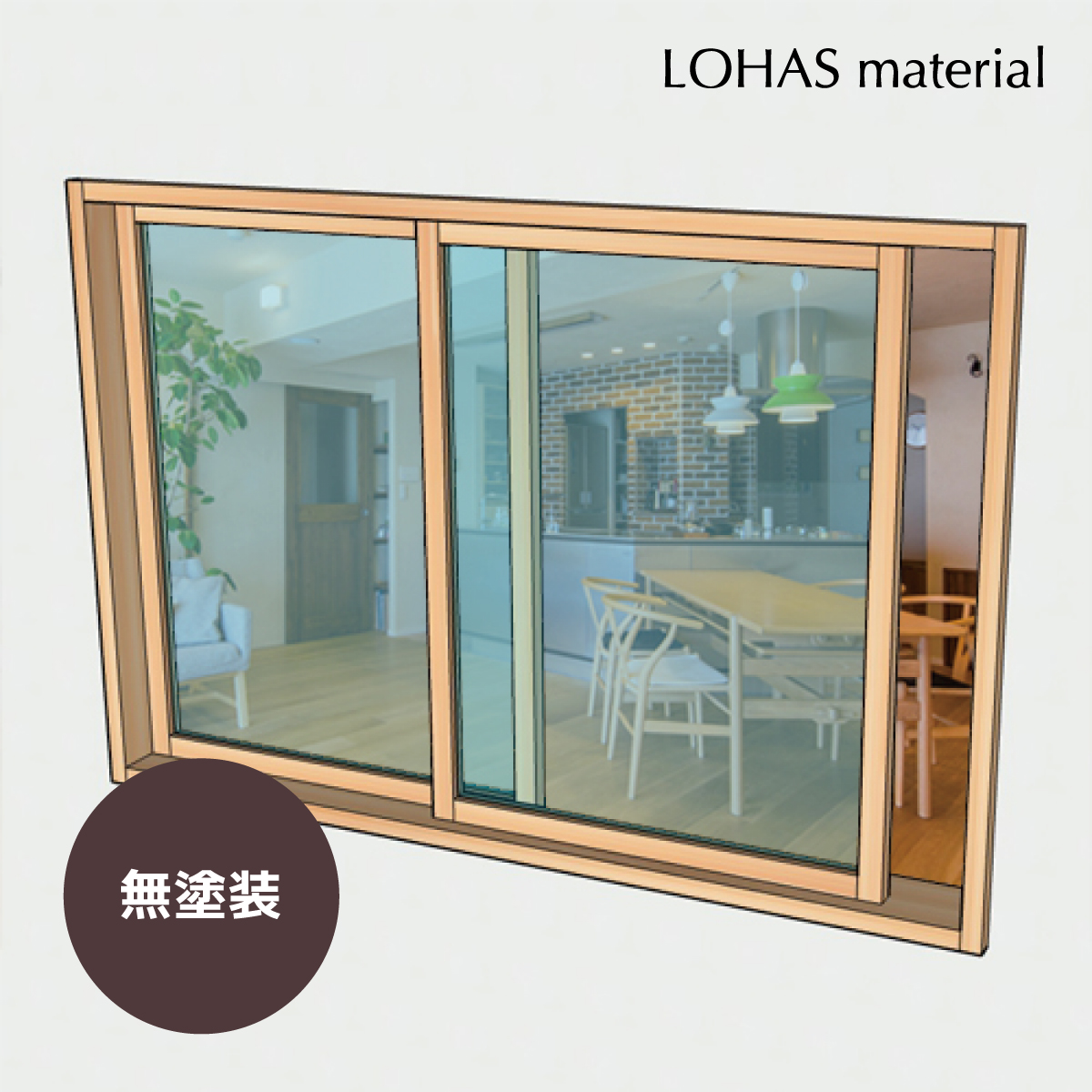 LOHAS material(ロハスマテリアル) 室内窓 通風窓 インテリアウィンドウ 引違窓(細框30mm敷居すべり仕様) パイン 無塗装 W1200×H800mmの説明