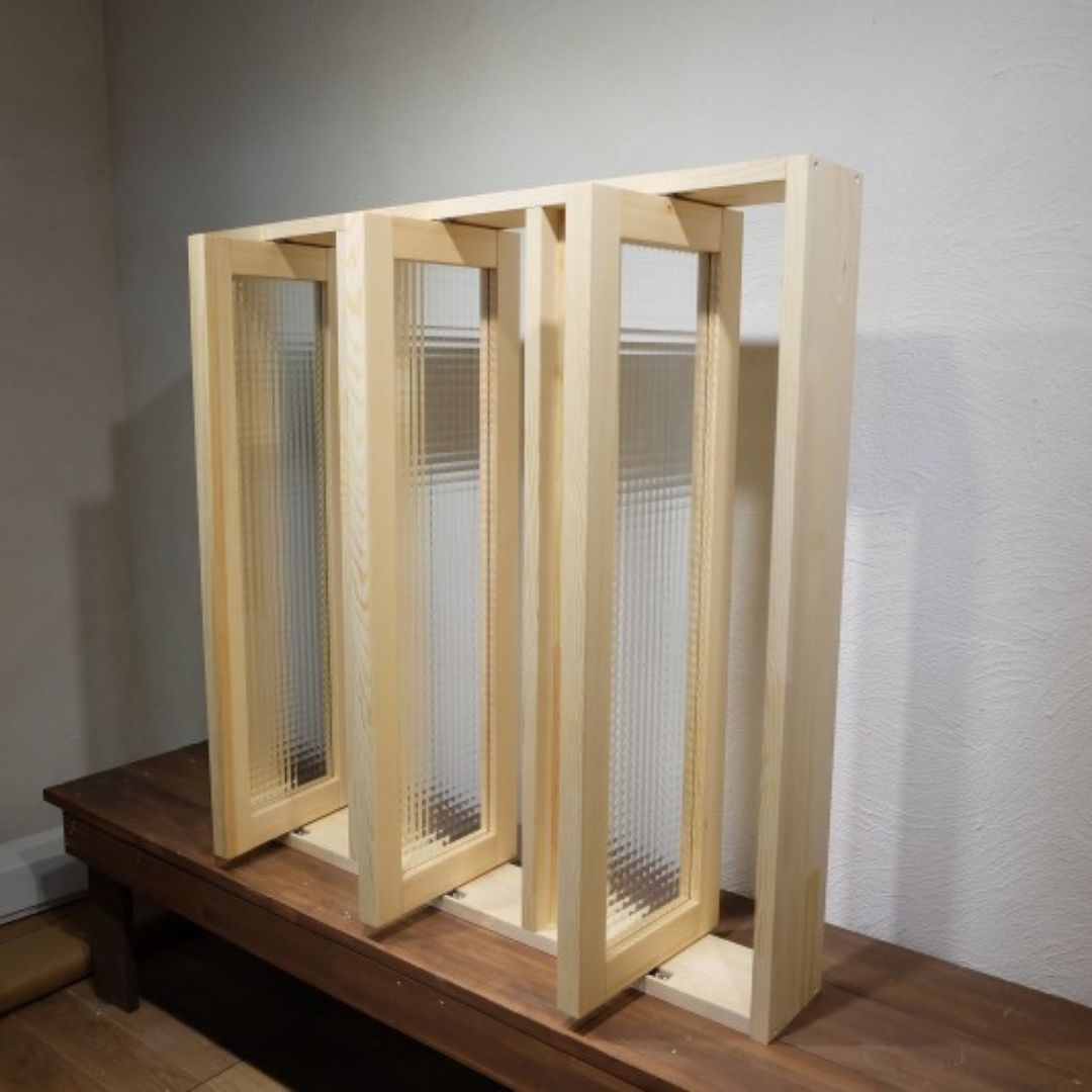 「サイズオーダー 室内窓 通風窓 インテリアウィンドウ 連窓 縦軸回転窓 横3連 パイン 自然オイル塗装 W1100×H1050mm プレハング込」のレビューを書く